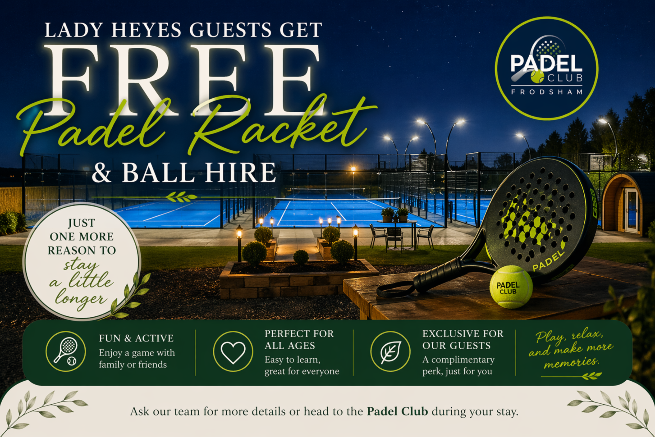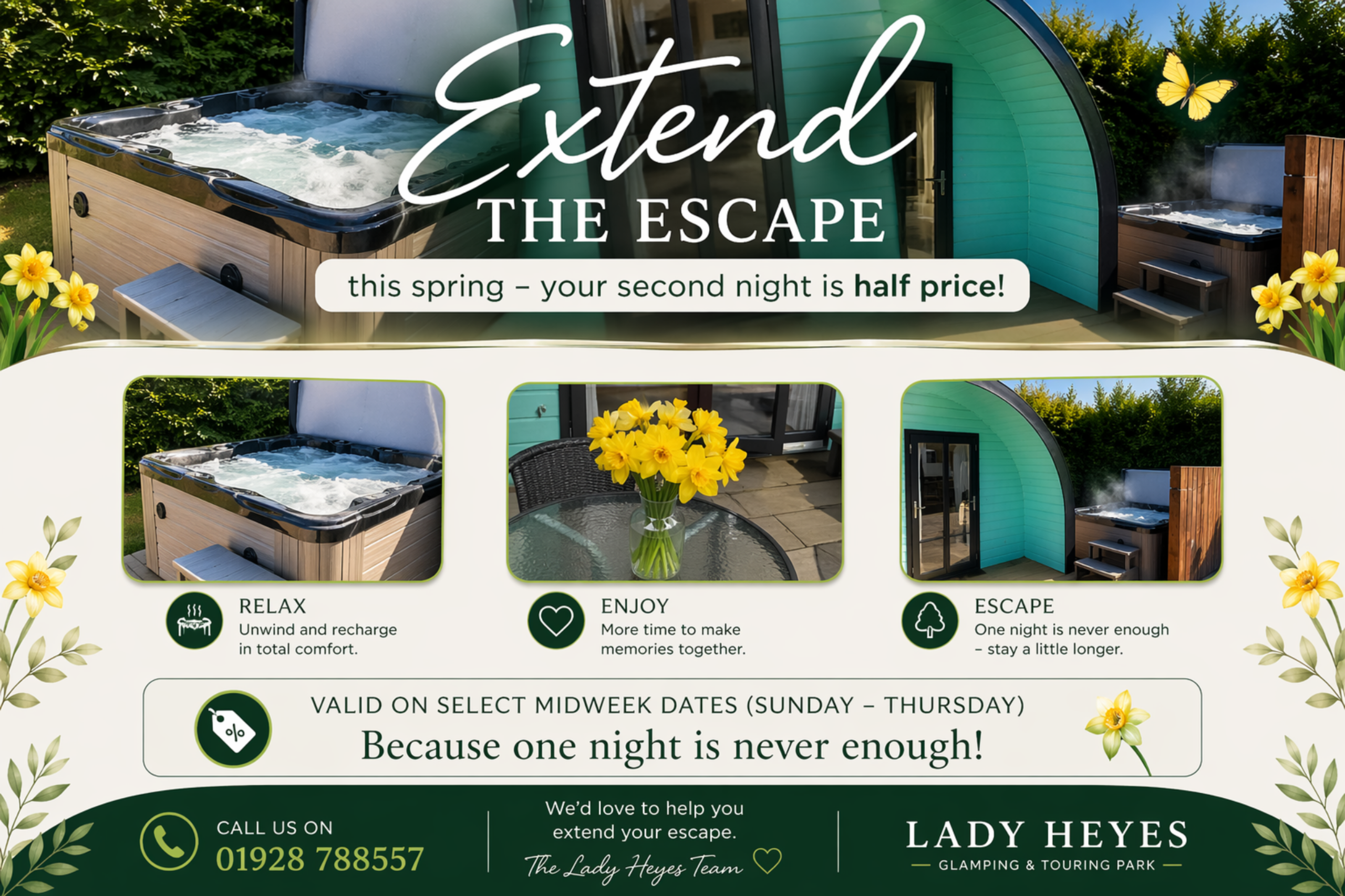 Sign up to our newsletter and be the first to receive our latest news, events and special offers or visit our Facebook @LadyHeyesHolidayPark / Instagram @CheshireGlamping